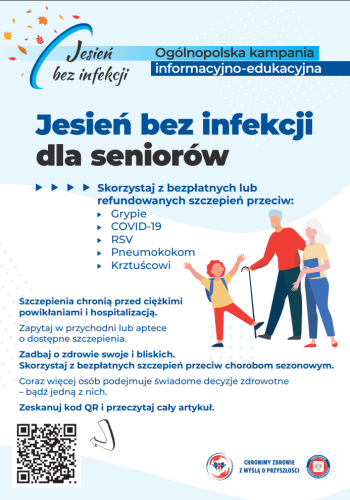 W związku z trwającą ogólnopolską kampanią informacyjno-edukacyjną „Jesień bez infekcji” kierowaną między innymi do seniorów, Państwowy Powiatowy Inspektor Sanitarny w Legnicy, zaprasza do szczepień ochronnych przeciwko chorobom infekcyjnym, nasilającym się w sezonie jesienno-zimowym.