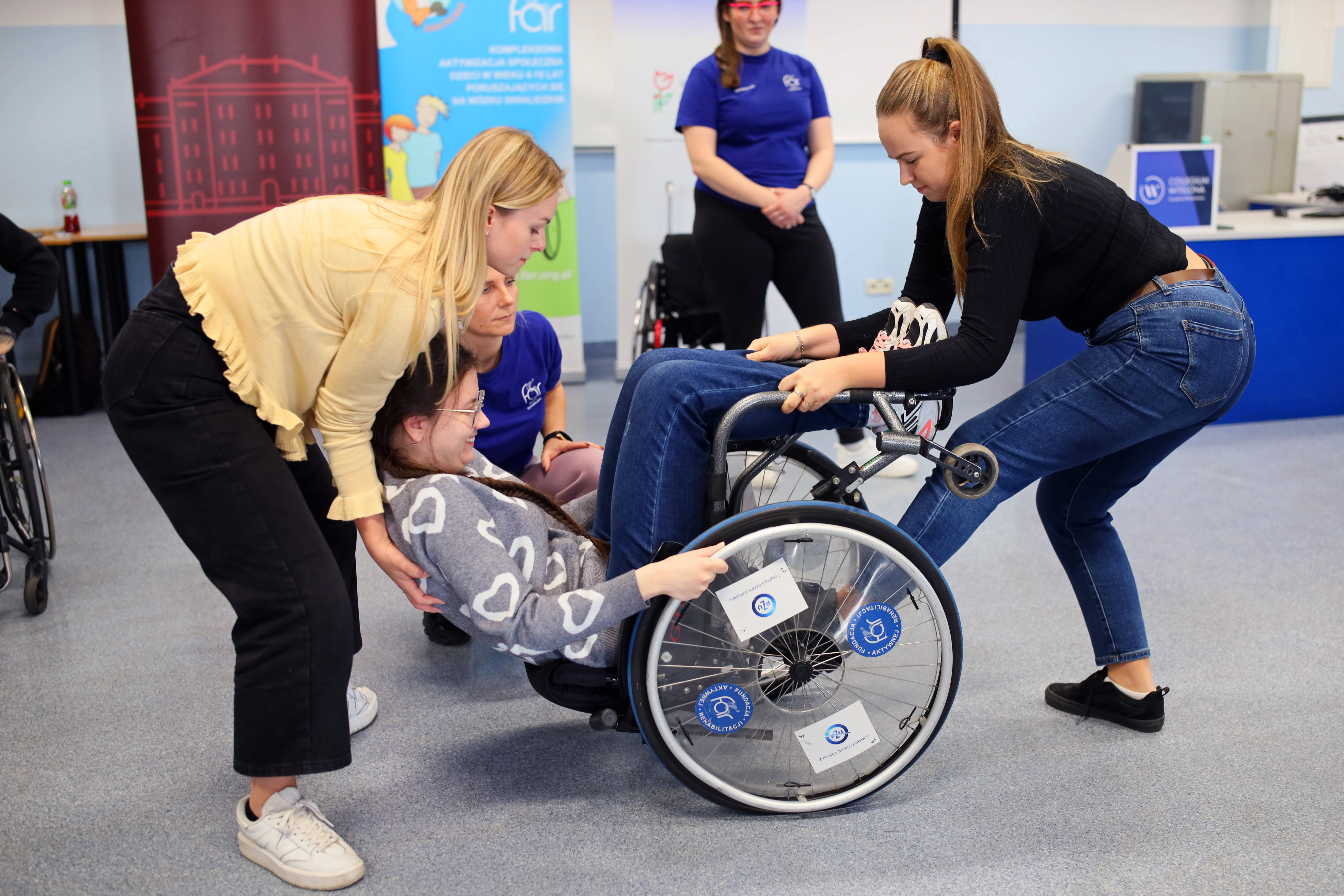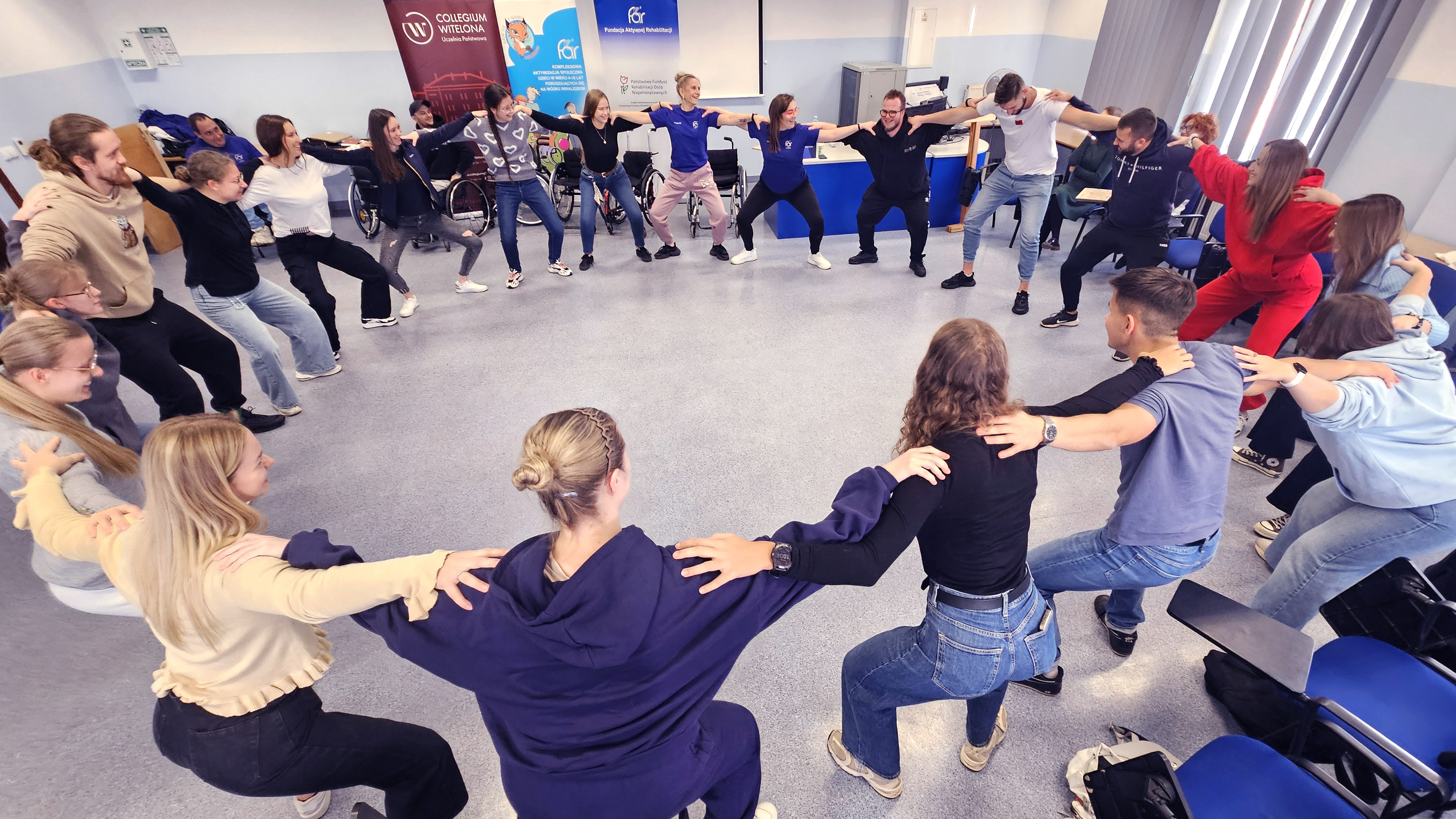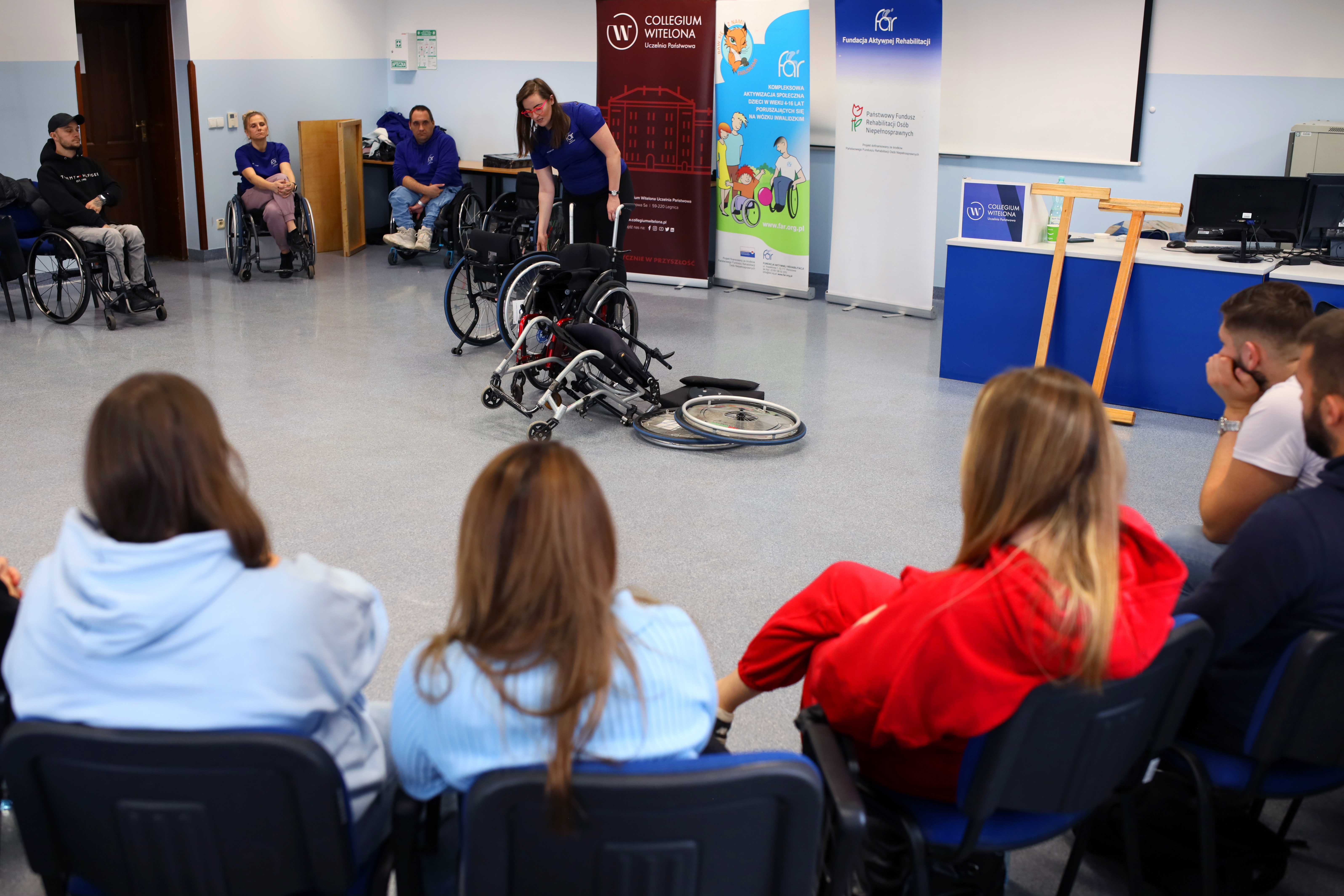 Podczas spotkania studenci mieli okazję bliżej poznać ideę aktywnej rehabilitacji – nowoczesnego podejścia łączącego ruch, sport i samodzielność w procesie wspierania osób z niepełnosprawnościami. Goście z Fundacji zaprezentowali, w jaki sposób te założenia są wdrażane w praktyce oraz jak ogromne znaczenie ma aktywność fizyczna w procesie powrotu do samodzielnego życia.