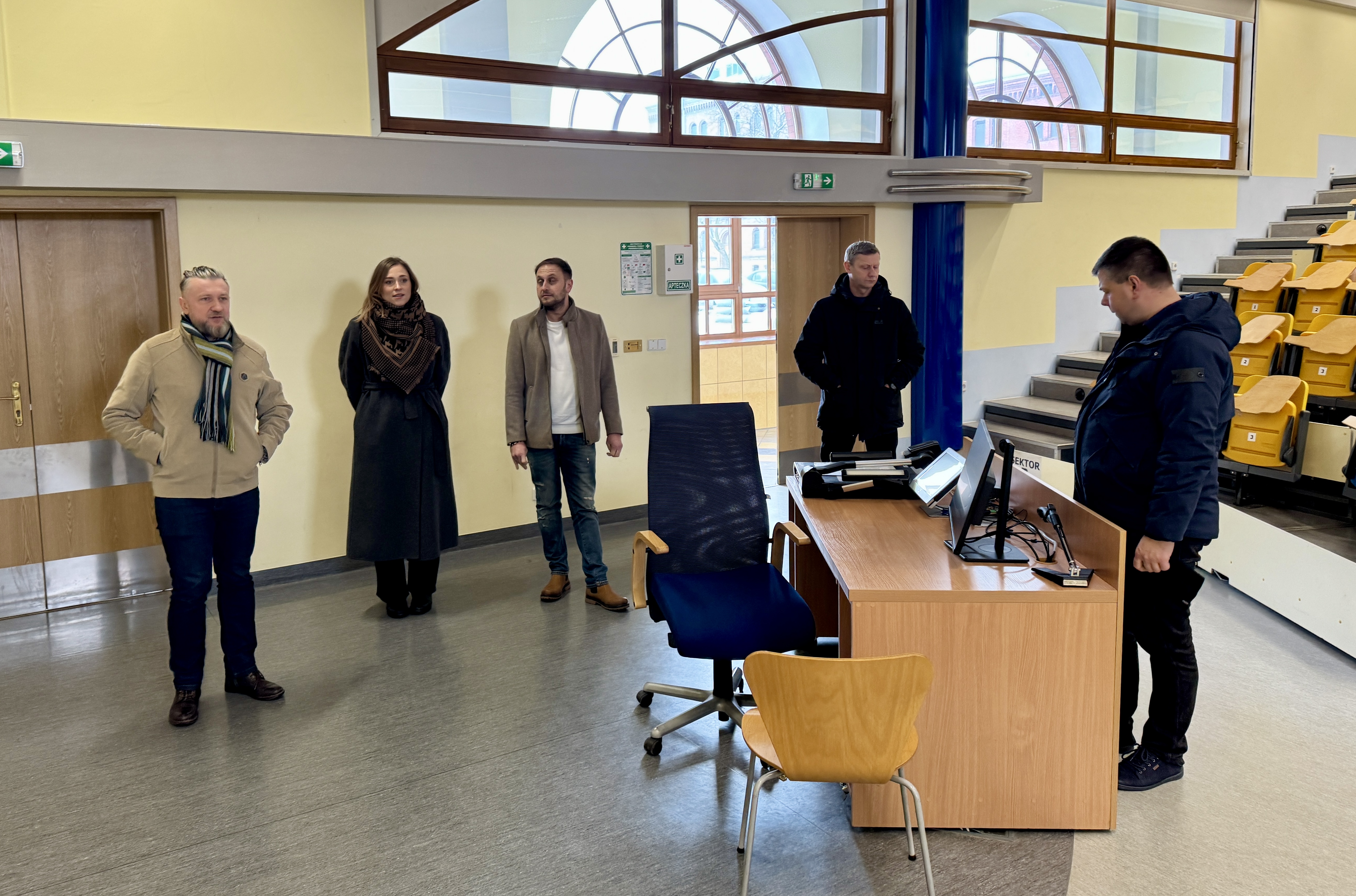 Nasi Goście poznali infrastrukturę Uczelni - zaplecze technologiczne, w pełni wyposażone Centrum Konferencyjno-Widowiskowe oraz profesjonalne studio nagrań. To przestrzenie, które wspierają rozwój kompetencji przyszłych specjalistów i umożliwiają realizację projektów na styku nauki i biznesu.
