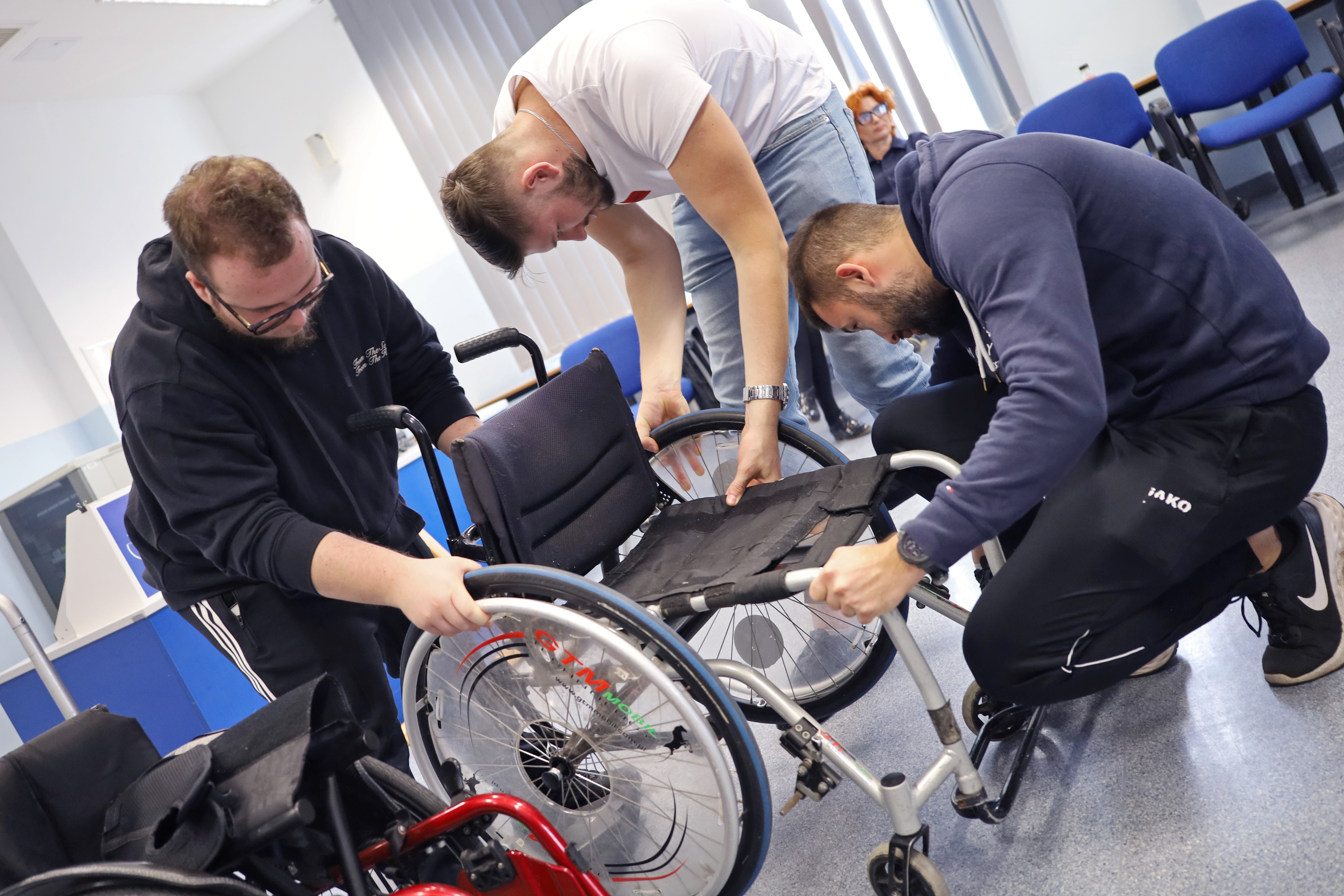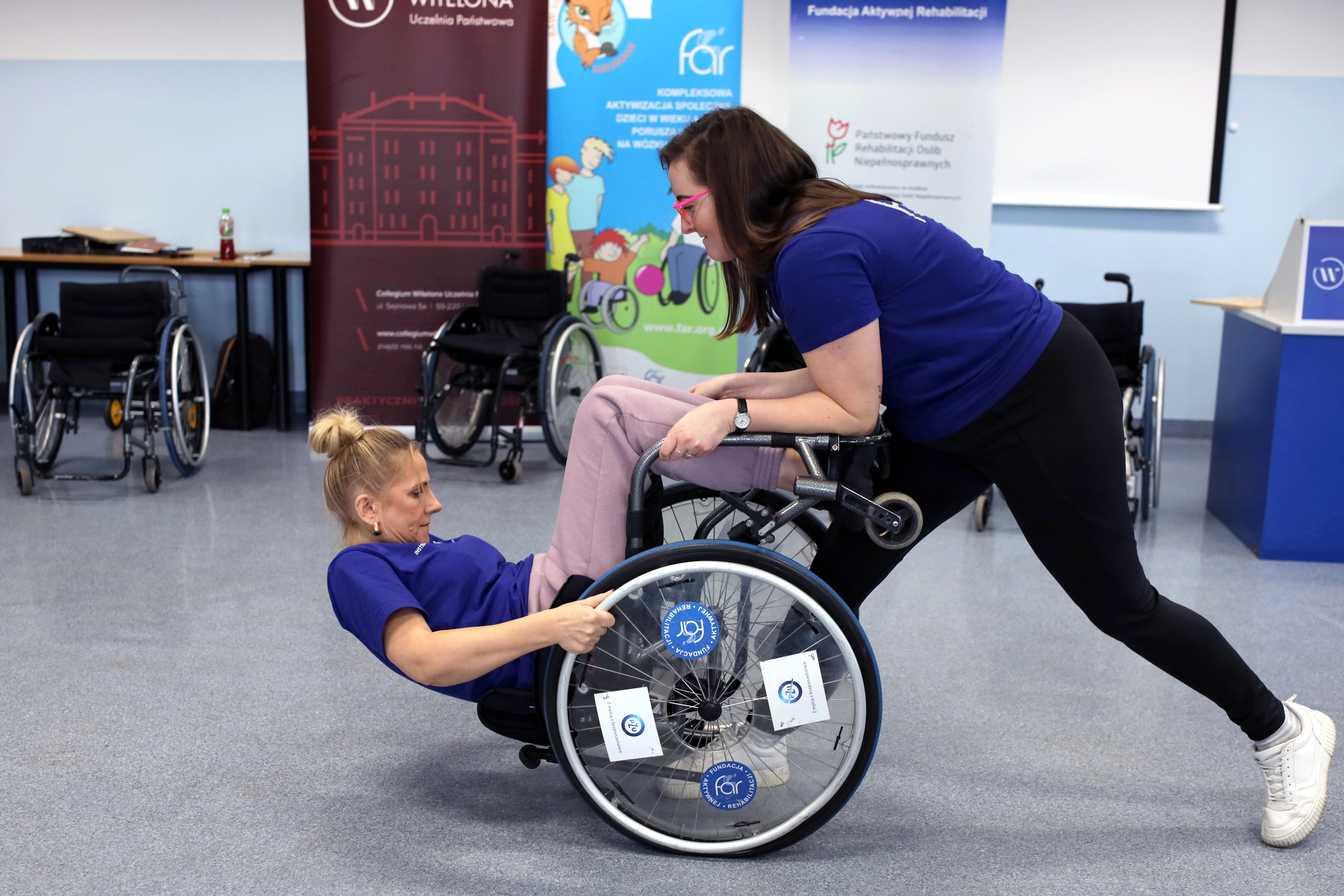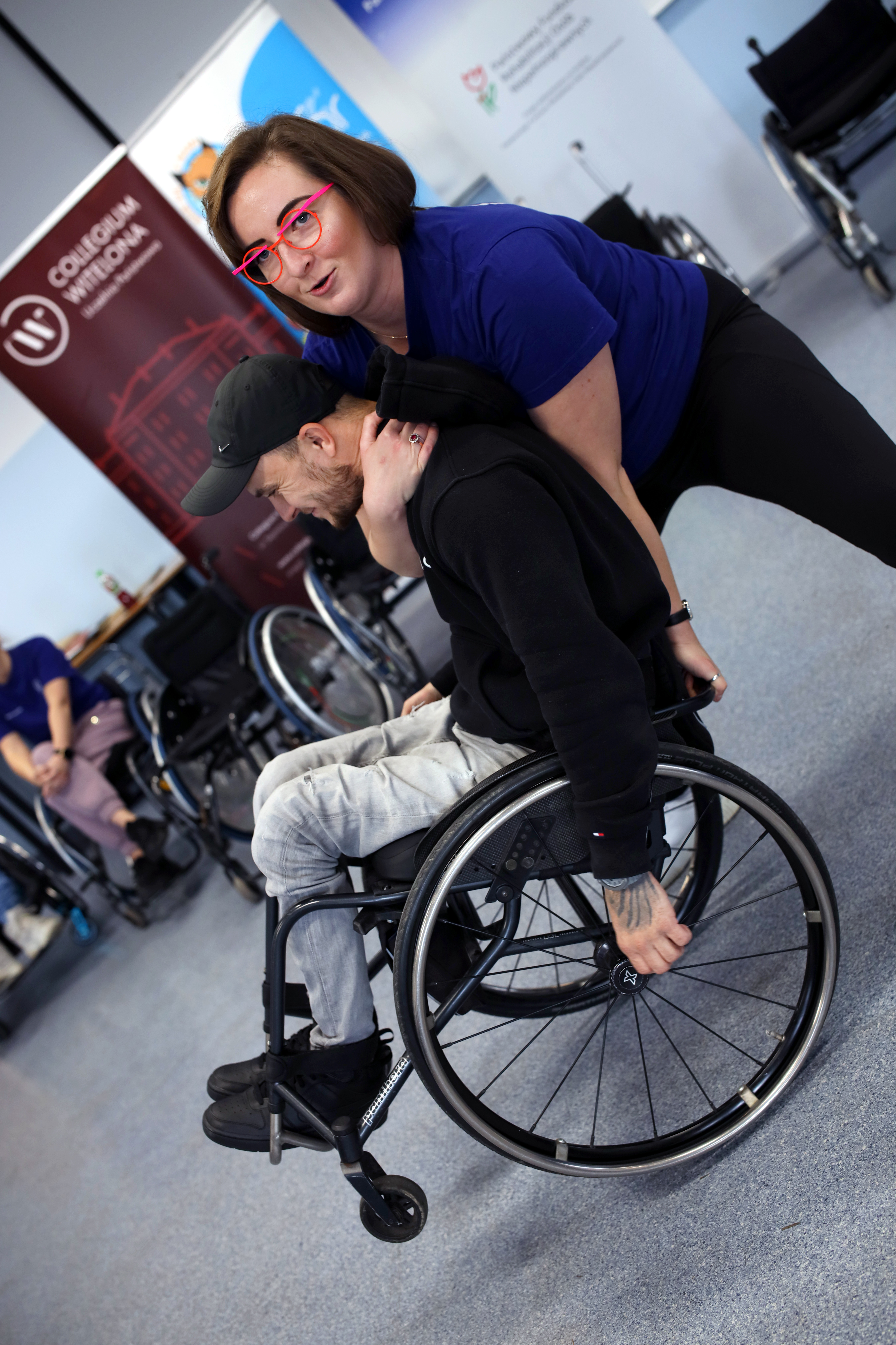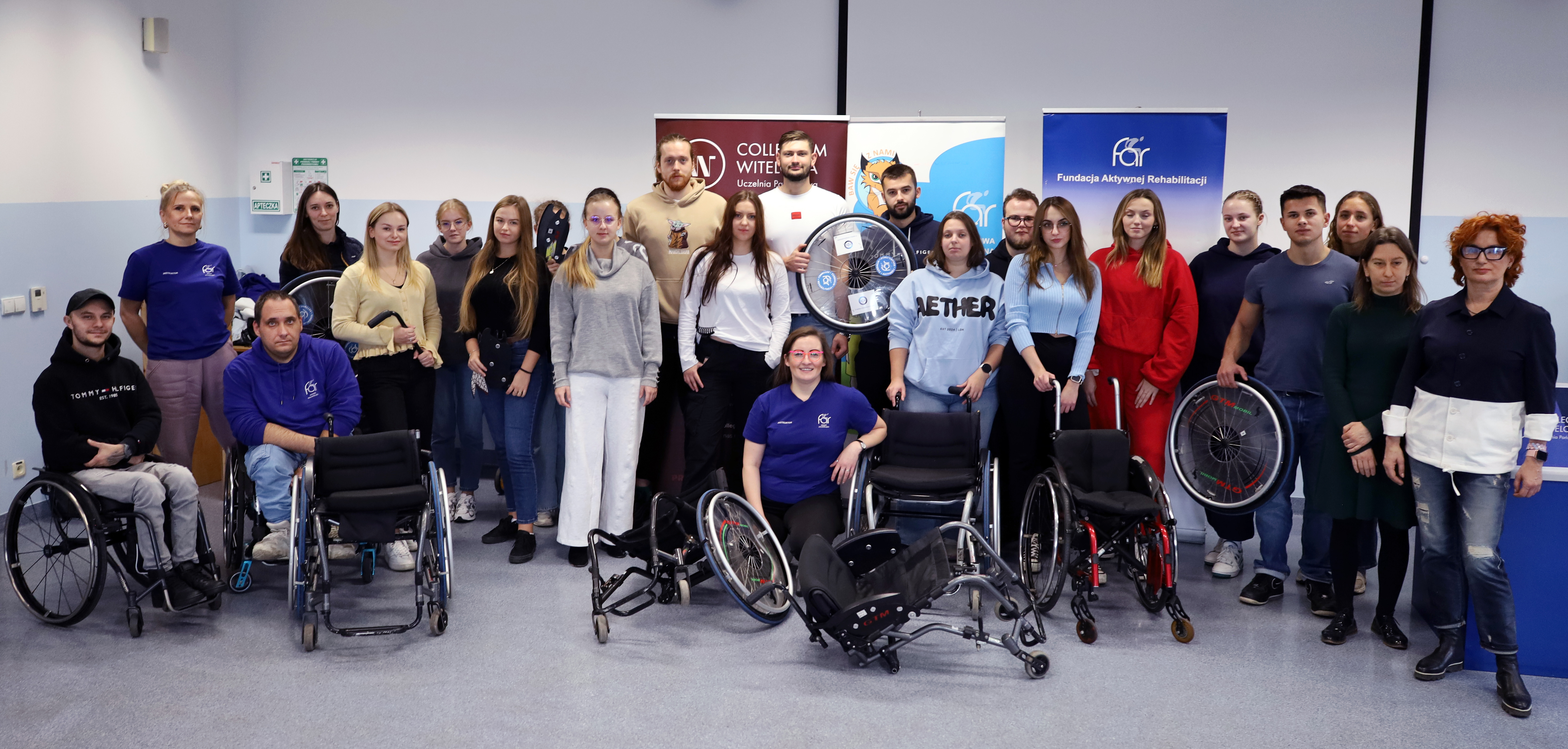 Podczas spotkania studenci mieli okazję bliżej poznać ideę aktywnej rehabilitacji – nowoczesnego podejścia łączącego ruch, sport i samodzielność w procesie wspierania osób z niepełnosprawnościami. Goście z Fundacji zaprezentowali, w jaki sposób te założenia są wdrażane w praktyce oraz jak ogromne znaczenie ma aktywność fizyczna w procesie powrotu do samodzielnego życia.