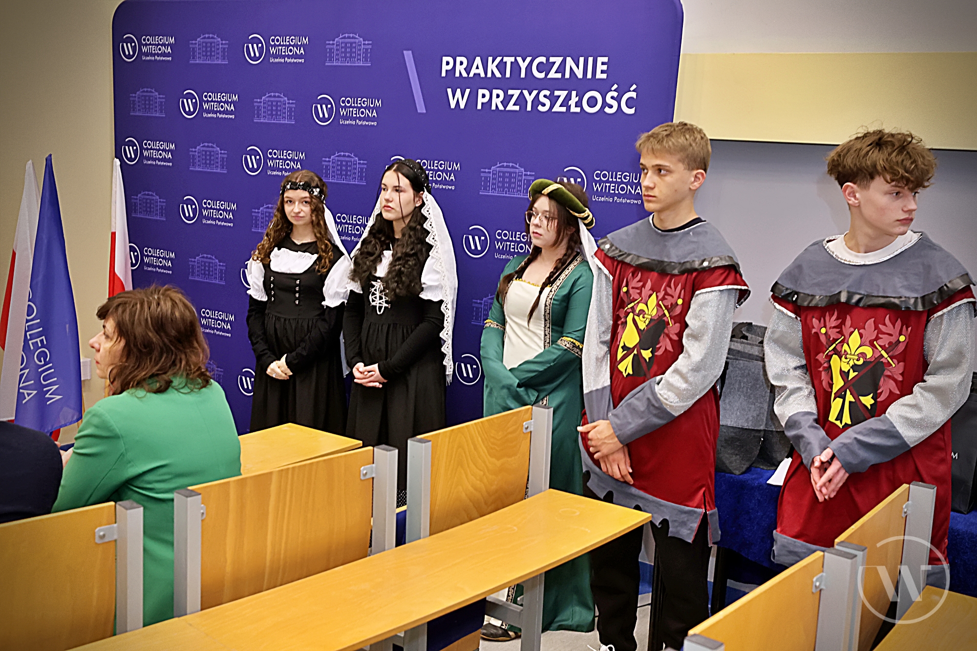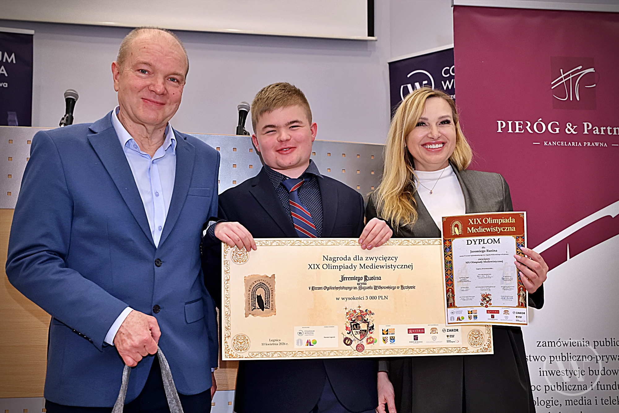 Uroczyste zakończenie w Sali E1 Collegium Witelona zgromadziło przedstawicieli władz Uczelni, Stowarzyszenia „Wspólnota Akademicka”, samorządu, partnerów, sponsorów, opiekunów oraz finalistów z wielu miast Polski. To właśnie ta obecność tylu osób zaangażowanych w edukację i rozwój młodych ludzi najlepiej pokazuje, jak ważnym wydarzeniem stała się Olimpiada. Najbardziej wyczekiwanym momentem było oczywiście ogłoszenie zwycięzcy. Tytuł zwycięzcy XIX Olimpiady Mediewistycznej A.D. 2026 zdobył Jeremi Rusin, uczeń V Liceum Ogólnokształcącego im. Augusta Witkowskiego w Krakowie. W gronie laureatów znaleźli się również: Antoni Droździewicz, Alicja Kwapiszewska, Maria Majsak oraz Antoni Rybicki – uczniowie V Liceum Ogólnokształcącego im. Augusta Witkowskiego w Krakowie, Szymon Wąsowicz – uczeń VI Liceum Ogólnokształcącego im. Adama Mickiewicza w Krakowie, a także Piotr Olech – uczeń XVIII Liceum Ogólnokształcącego im. Jana Zamoyskiego w Warszawie. Podczas uroczystości wyróżniono również finalistów i ich opiekunów, bo za każdym takim sukcesem stoją nie tylko talent i praca uczniów, ale także codzienne wsparcie nauczycieli. Wyjątkowym momentem było także wręczenie nagrody specjalnej w konkursie wiedzy o bitwie legnickiej 1241, ufundowanej przez Wójta Gminy Legnickie Pole oraz Fundację Legnickie Pole 1241. Otrzymał ją Szymon Wąsowicz, uczeń VI Liceum Ogólnokształcącego im. Adama Mickiewicza w Krakowie. Otrzymał Medal Henryka II Pobożnego nadany przez Fundację Legnickie Pola 1241, wręczył go Pan Marek Mojecki, członek Rady Fundacji w roli księcia Henryka. Statuetkę Wójta Gminy Legnickie Pole Rafała Plezia i nagrodę w kwocie 700 zł w postaci karty zakupowej w sieci Empik. Cieszymy się również z obecności naszych uczniów – Oliwiera Kobiaka, Weroniki Umżyńskiej i Khrystyny Fijałko, którzy z dumą reprezentowali Akademickie Liceum Ogólnokształcące im. Witelona w Legnicy.